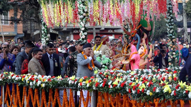 Kathmandu, Nov 19: President Ramchandra Paudel worshiped the Chhathi Mai on the occasion of Chhath Puja today. President Paudel visited the Chhath Puja site on the bank of Kamal Pokhari in the evening. He also made offerings of argha (curd) to the setting sun at the Chhath Puja ceremony near