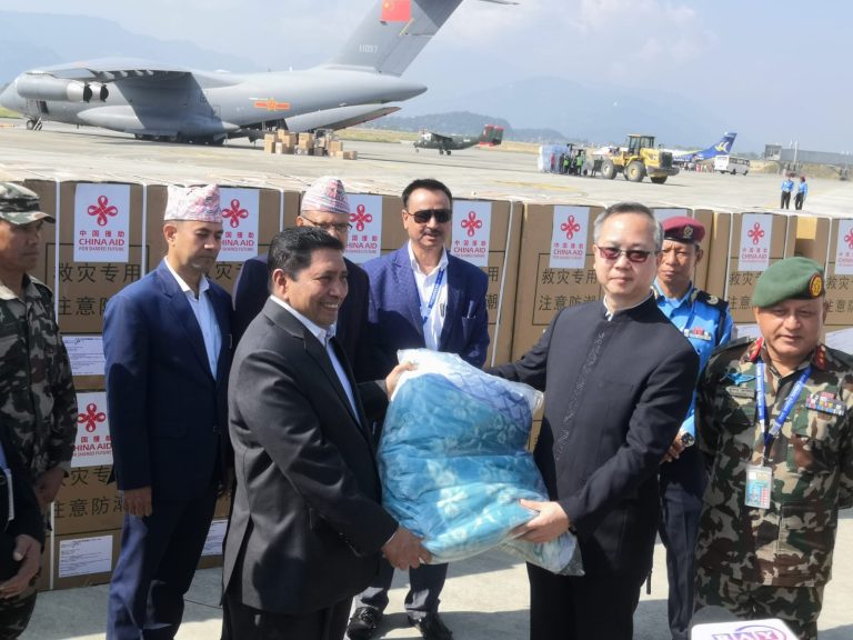 Kathmandu, Nov 8: Deputy Prime Minister and Home Minister Narayan Kaji Shrestha receives the emergency relief materials provided by the Government of PR China at Pokhara Int'l Airport. Chinese Ambassador to Nepal Chen Song handed over the materials worth RMB 15 million. Fifty tons of relief materials was carried by