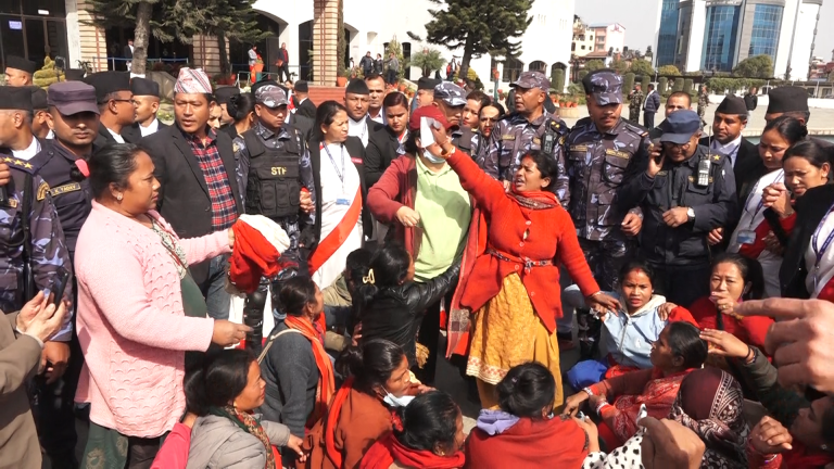 Kathmandu, Feb 26: The victims of microfinance and cooperatives have protested in the Parliament building premises today. When the parliament session was going on in the federal parliament building in Naya Baneshwar, the victims forcibly entered the parliament building premises and shouted slogans. Kathmandu Valley Police Chief AIG Deepak Thapa