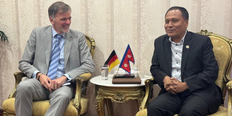Kathmandu, Oct 15: German Ambassador to Nepal, Udo Eugen Volz, paid a courtesy call on Minister for Energy, Water Resources and Irrigation Kulman Ghising today. In the meeting held in the Ministry of Energy, Water Resources and Irrigation at Singha Durbar, Ambassador Volz congratulated Minister Ghising and wished him a