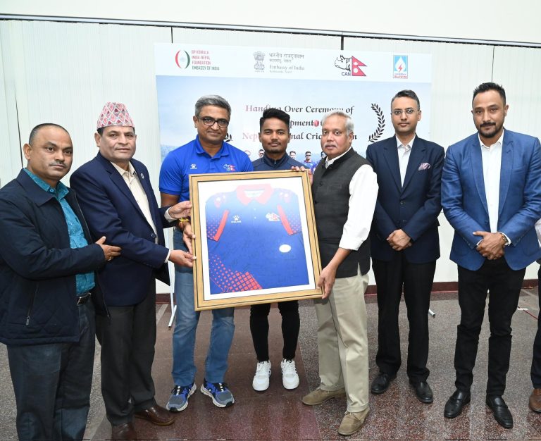 Kathmandu, Oct 27: Embassy of India, Kathmandu warmly welcomed the Nepal National Cricket Team led by Captain Rohit Paudel and the executive members of the Cricket Association of Nepal at the Embassy today. At the event, Ambassador of India to Nepal Naveen Srivastava handed over professional sporting equipment, including 20