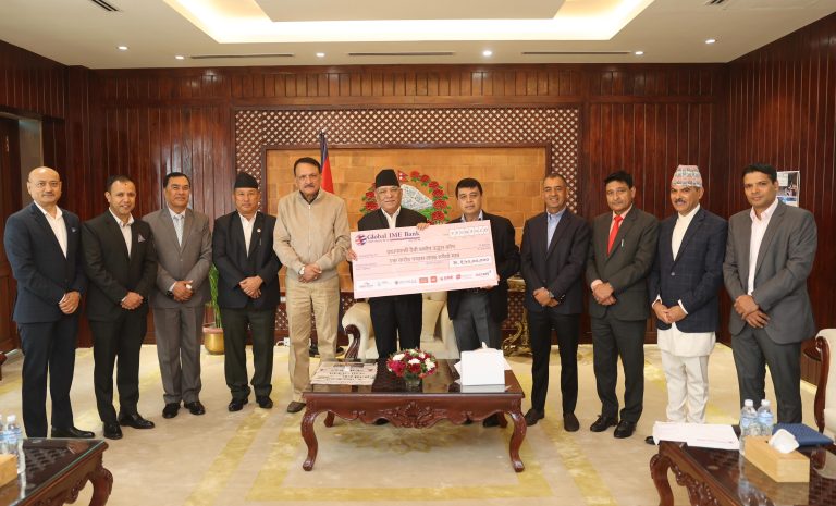 Kathmandu, Nov 7: Chairman of IME Group and the Global IME Bank, Chandra Prasad Dhakal today handed a cheque for Rs 15 million to Prime Minister Pushpa Kamal Dahal 'Prachanda'. The amount is provided as relief to the earthquake-affected people of Jajarkot and Rukum Paschim. It is the monetary assistance