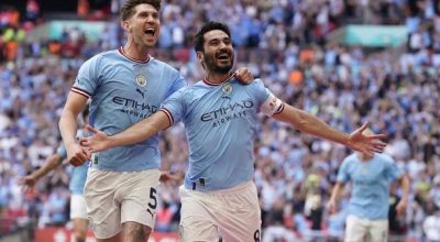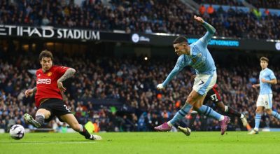 Manchester City’s mission to win a treble of major trophies stayed on track after beating Manchester United 2-1 in the