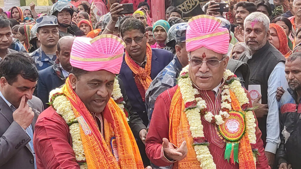 -Ajay Kumar Saha/RSS Dhanusha, Feb 23 (RSS) : Chairman of Nepal Communist Party (NCP), Pushpa Kamal Dahal, inaugurated the Mithila circumambulation by lifting the palanquin of Mithilabihari God. He also showered flowers from the helicopter in the premises of Mithilabihari Temple here today. On the occasion, Chairman Dahal announced
