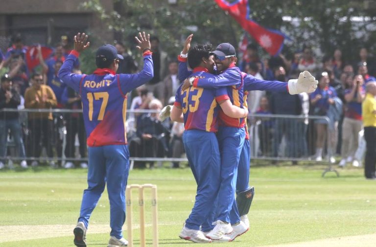 Kathmandu, June 18: Nepal secured a thrilling two-wicket victory over Scotland in a low scoring Tri-Nation T20 International Series held at The Grange Cricket Club in Scotland. Chasing a modest target of 98 runs, Nepal reached the target in 19.5 overs, losing 8 wickets in the process. Kushal Bhurtel was