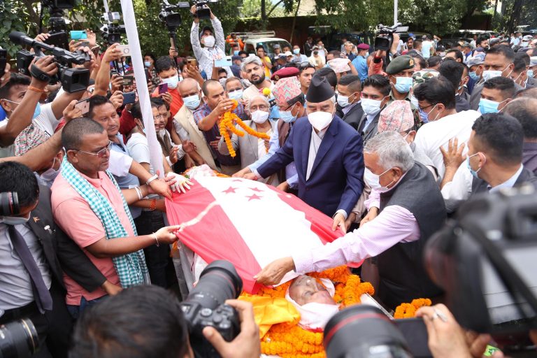Nepali Congress (NC) President and Prime Minister Sher Bahadur Deuba paid tributes to party leader and lawmaker Pradeep Giri who passed away at the age of 74 while undergoing treatment at Mediciti Hospital in Lalitpur at 9:30 pm on Saturday. He was a cancer patient. Draping a party flag on
