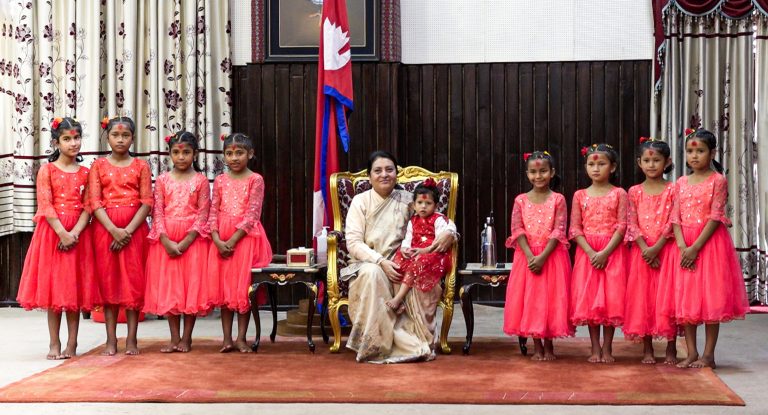President Bidya Devi Bhandari today performed nava kanya puja (worship of nine virgin girls) on Maha Navami, the ninth day of Bada Dashain. Nava kanya are considered as the incarnation of Goddess Nava Durga. The puja took place amid a special function organised at the office of the President, Sheetal
