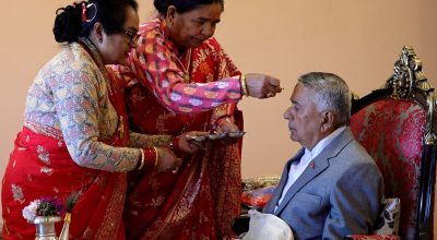 President Ramchandra Paudel received tika from his younger sisters Sharada Pandit and Chanda Ojha on the occasion of Bhaitika festival