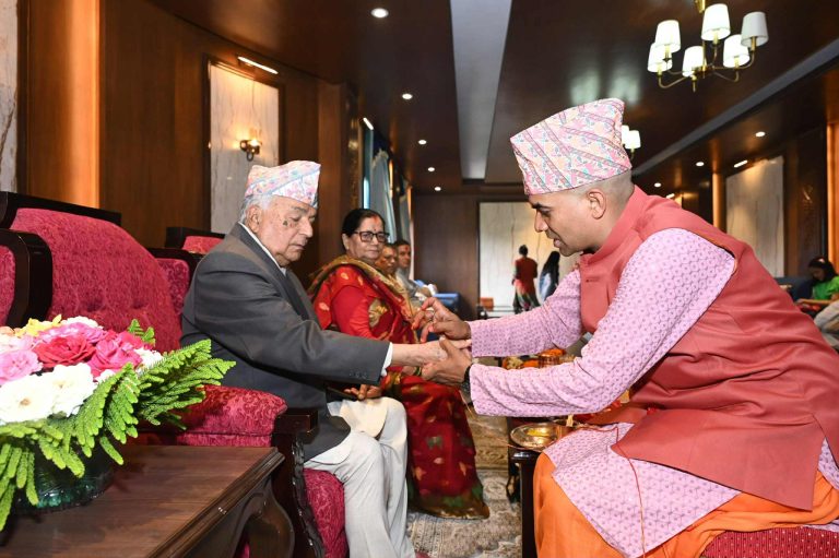 Kathmandu, Aug 9: President Ramchandra Paudel received the Rakshabandan (a sacred thread tied around the wrist) and the Nawayagyopavit (Janai) in accordance with the Vedic rituals on the occasion of Rakshabandhan and Janai Purnima festival today. President Paudel along with First Lady Sabita Paudel received the Rakshabandhan from priest Arjun