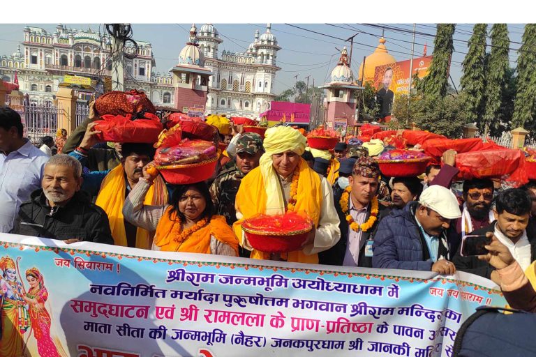 Janakpurdham, Jan 4: Janakpurdham has dispatched 'bhar' special gifts as offerings to Ayodhya, India, in view of a consecration ceremony to take place at the Shreeram Temple in Ayodhya on January 22. A team left here this morning, carrying special offerings for Ayodhya under the Janakpurdham-Ayodhyadham religious procession. Saroj Kumar