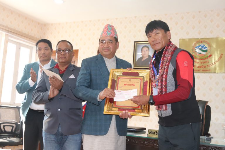 Minister of Culture, Tourism and Civil Aviation has awarded Sanu Sherpa, the first person to doubly summit the 14 highest mountains in the world above 8,000 metres above the sea level (also colloquially known as eight thousanders). Sherpa, who hails from Makalu rural municipality in Sakhuwasabha district, was awarded for