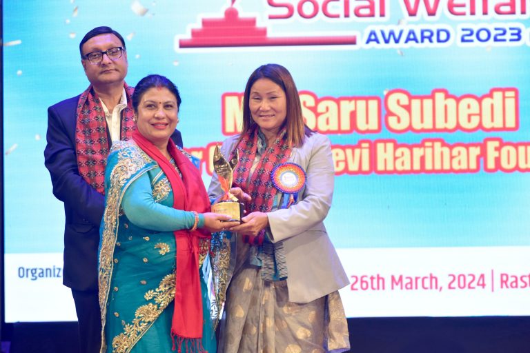 Kathmandu: Saru Subedi, the founder/president of Tulasalaya, located at Bhaisepati, Lalitpur, along with other personalities have been awarded by the National Welfare Award – 2023. The event was organized by Season Media recently at the National Theatre, Jamal, and had the deputy speaker, Indira Ranamagar, and the Chairman of the