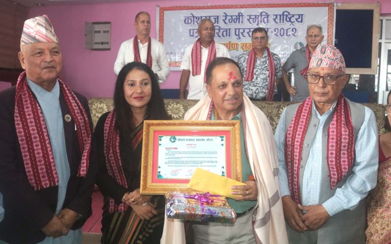 Morang, Aug 23: Senior journalist Tirtha Koirala has been awarded the Koshraj Regmi Memorial Journalism Award, 2082 BS. Speaker of the Koshi Province Assembly, Ambar Bahadur Bista, awarded journalist Koirala, the Chair of Nepal Press Institute, amidst a programme organised by the Pitambar-Khileshwori Memorial Trust and the Federation of Nepali