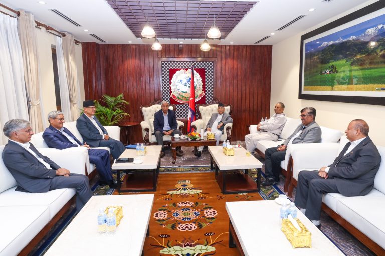 Kathmandu, July 14: A meeting was held among top leaders of ruling alliance—CPN (UML), Nepali Congress and Janata Samajbadi Party Nepal. During the meeting held at the official residence of the Prime Minister at Baluwatar on Monday, Prime Minister and CPN (UML) Chairperson KP Sharma Oli, Nepali Congress President and