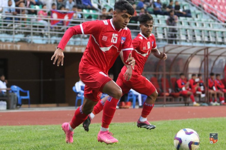 Kathmandu, Sept 25: Nepal has booked a place in the semi-finals of the U-19 SAFF football championship. In match held today at Dasharath Stadium in Tripureshwar, Kathmandu, Nepal defeated the Maldives by 4-1 to reach the last four. For the hosts, Sameer Tamang scored two goals while Prashant Laksham and