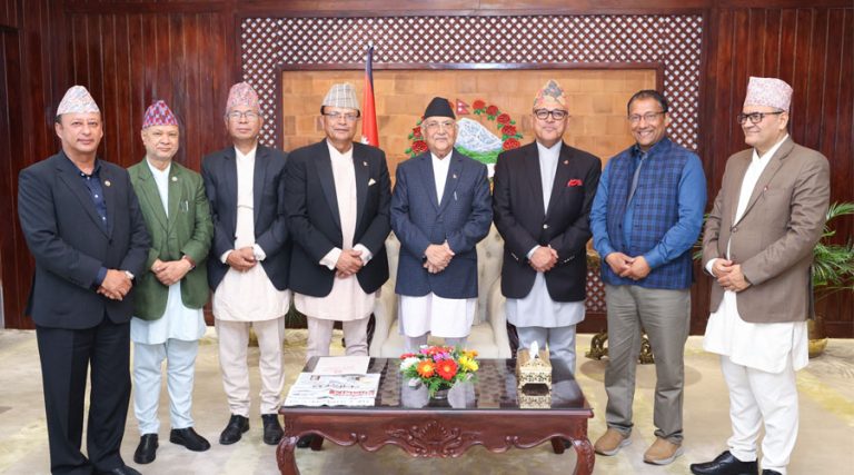 Kathmandu, May 10: The newly appointed office bearers of the Vidushi Yogmaya Himalayan Ayurved University (VYHAU) have been administered the oath of office and secrecy in the presence of Prime Minister KP Sharma Oli today. Chairman of the VYHAU, Dr Arjun Karki, Chancellor Prof Dr Ramesh Kumar Dhungel and Registrar