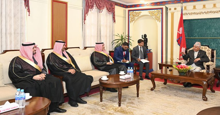 Kathmandu, Nov 25: Ambassador of Saudi Arabia to Nepal, Saad Nasser Abdullah Abu Haimed, paid a farewell call on President Ramchandra Paudel at the Office of the President, Shital Niwas today. During the meeting, they discussed various issues concerning the relationship between Nepal and Saudi Arabia as well as mutual