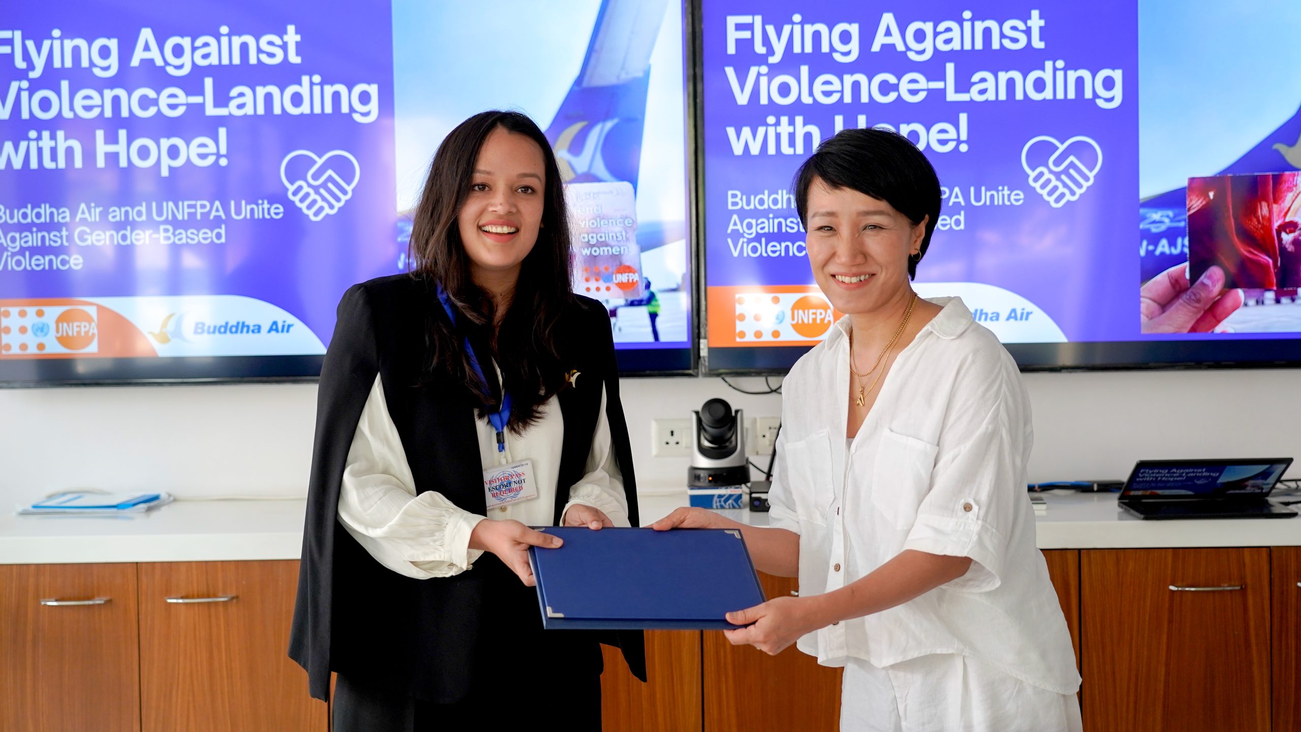 The representative for UNFPA in Nepal, Won Young Hong and Astha Basnet Thapa, the Executive Director at Buddha Air, officiated the agreement on behalf of their respective organizations.