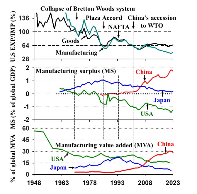 But one product of that conference – fixed exchange rates – turned out not to be all that good for the US, as it contributed to the precipitous decline of America’s share of global manufacturing value-added, from 55% in 1953 to 24% in 1970. US President Richard Nixon’s 1971 decision to delink the US dollar from gold mostly stabilized this share, which then remained roughly consistent for three decades. But it also turned the US from a surplus country into the world’s largest deficit country, as it fueled the rise of Japanese manufacturing.